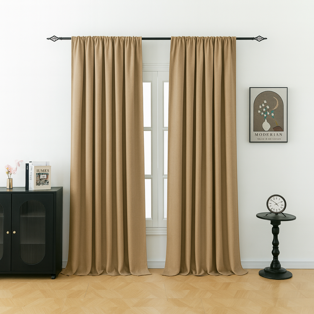 Wir empfehlen die 1,5- bis 2-fache Stoffbreite im Vergleich zur Schienen-/Stangenbreite. Beispielsweise werden für eine 200 cm lange Stange etwa 300–400 cm Vorhangstoff für einen eleganten Vorhang benötigt.