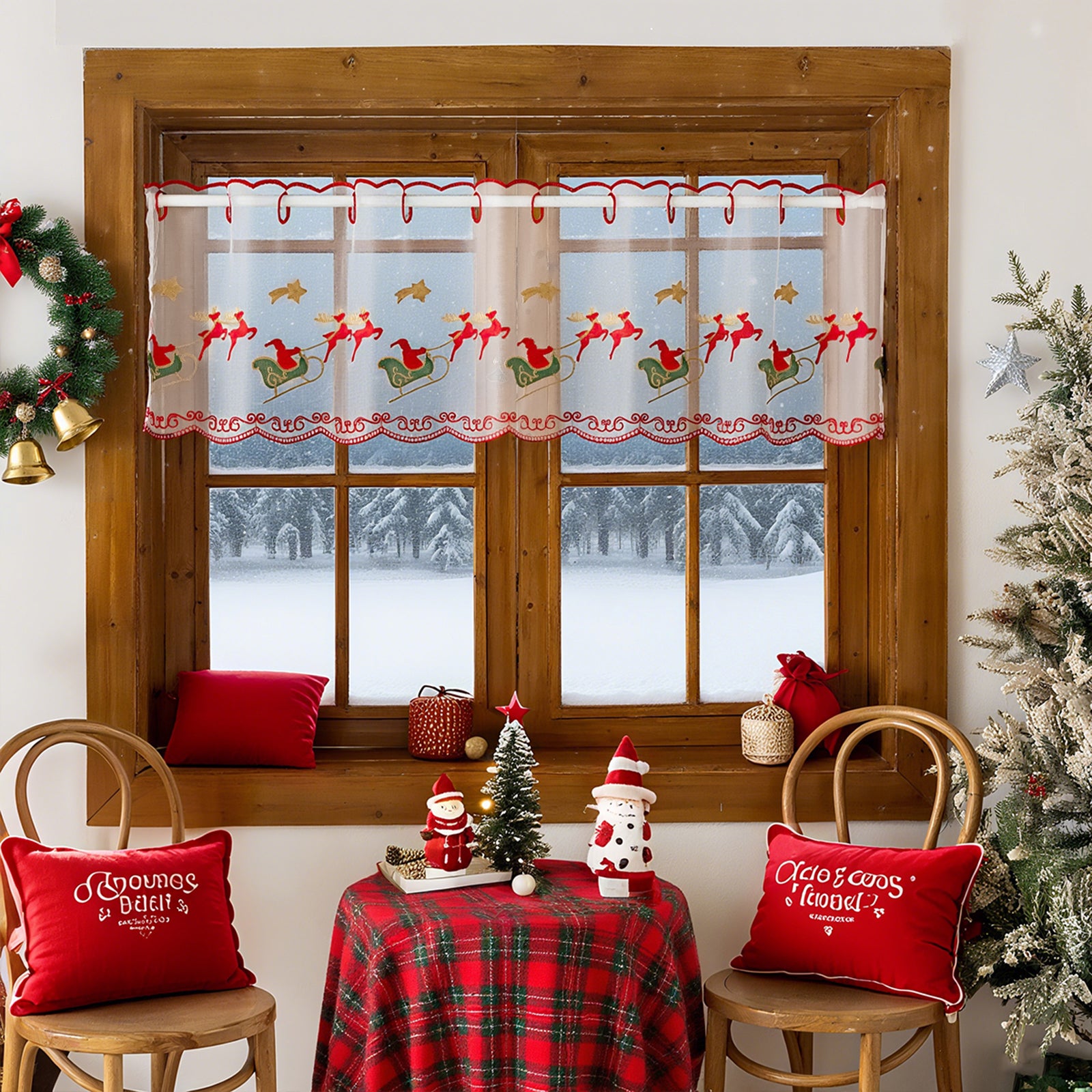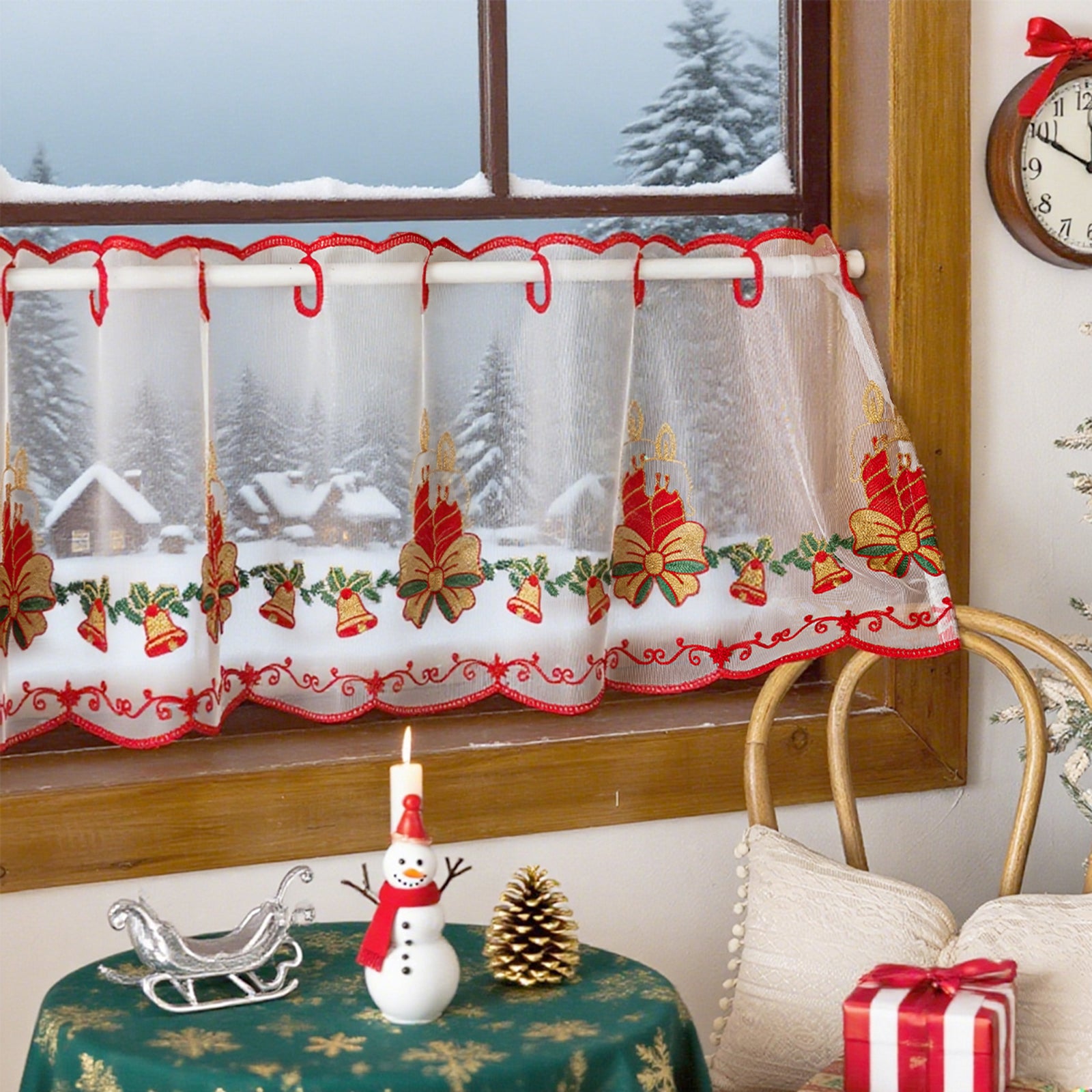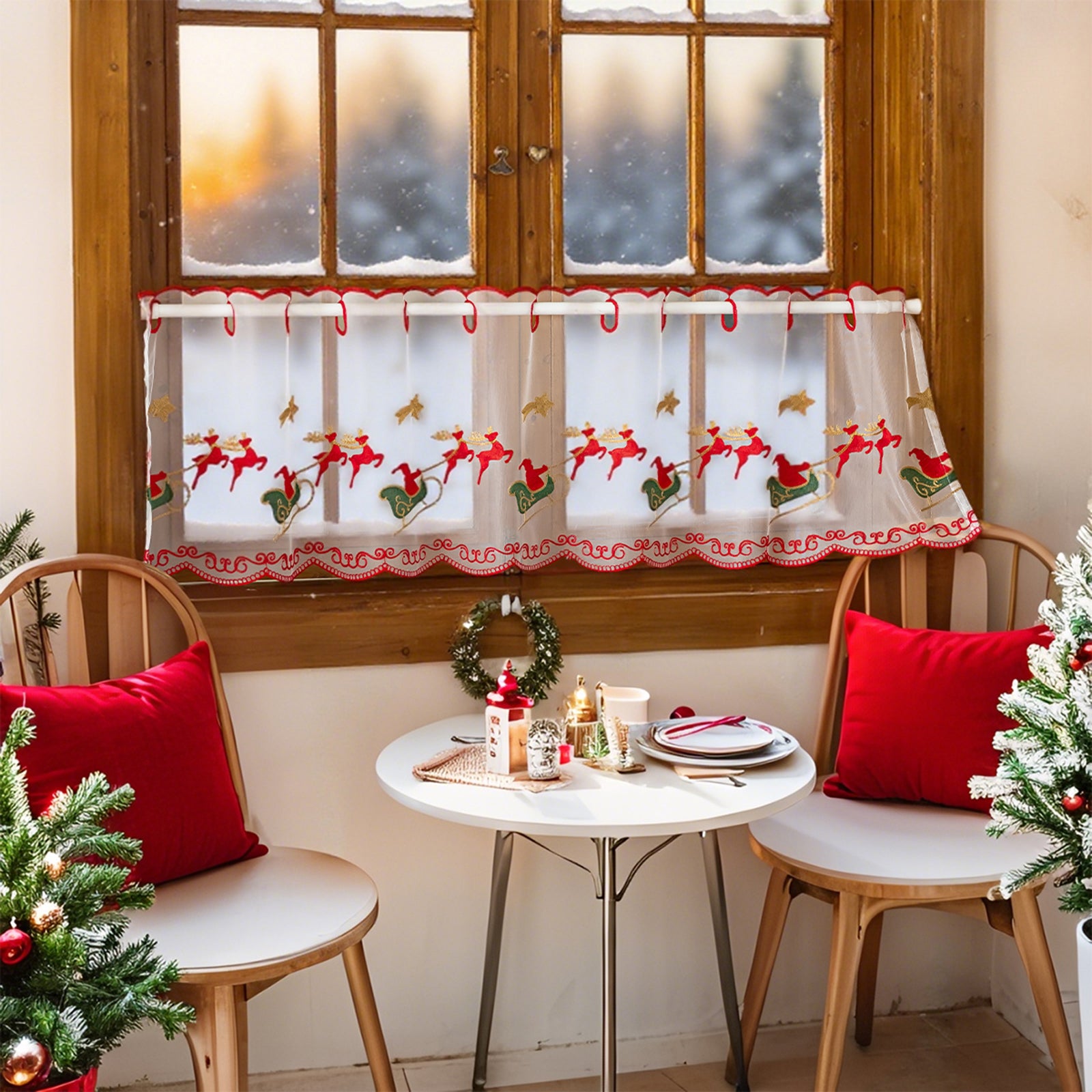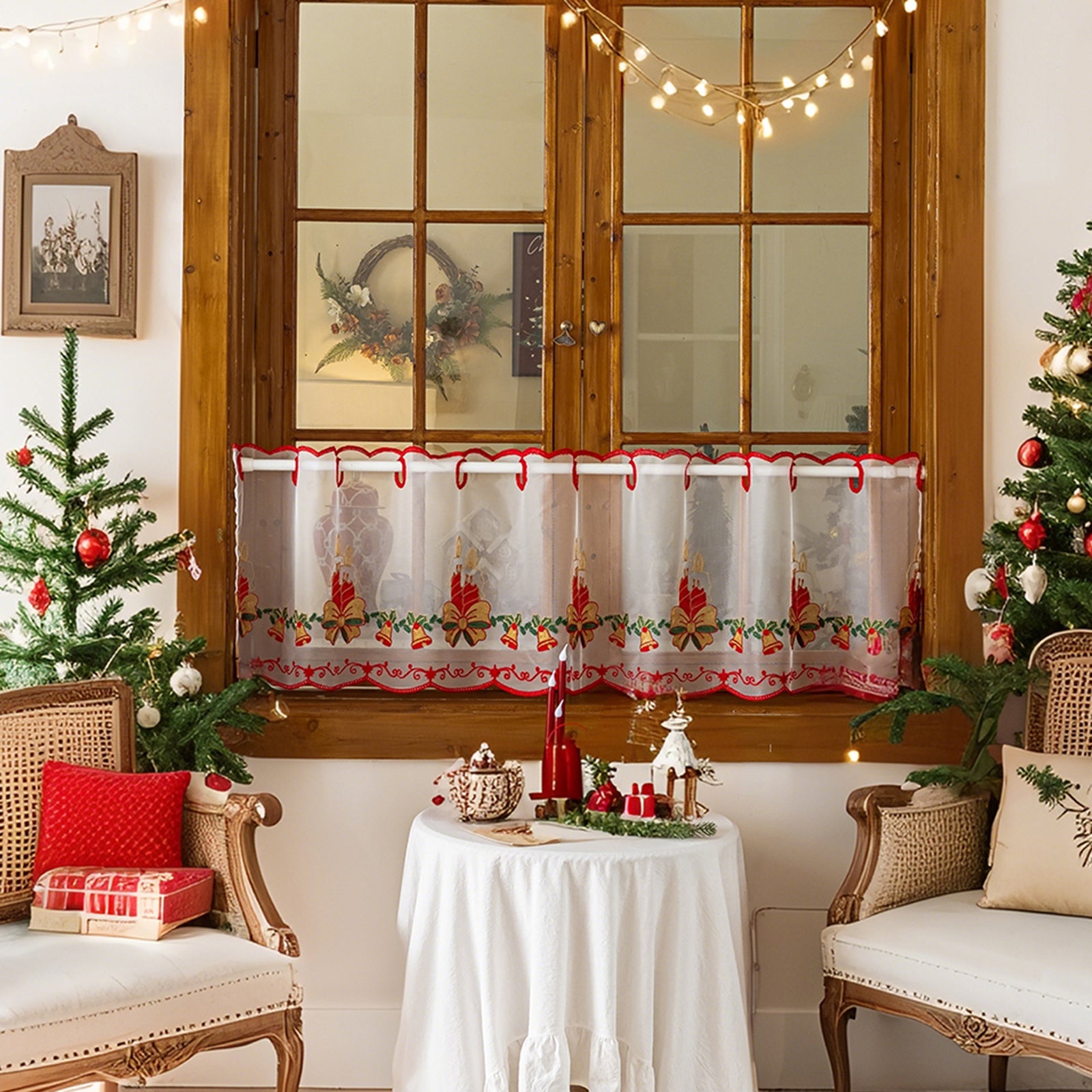 Diese weiße Kurzgardine mit roter und goldener Stickerei bringt festlichen Glanz in Ihr Zuhause. Das zarte, transparente Gewebe filtert das Licht sanft und verleiht jedem Raum eine warme, weihnachtliche Stimmung. Ideal für Küchen, Wohnzimmer oder Kinderzimmer – perfekt abgestimmt auf Ihre Weihnachtsdekoration mit Schneemann oder Tannenbaum.