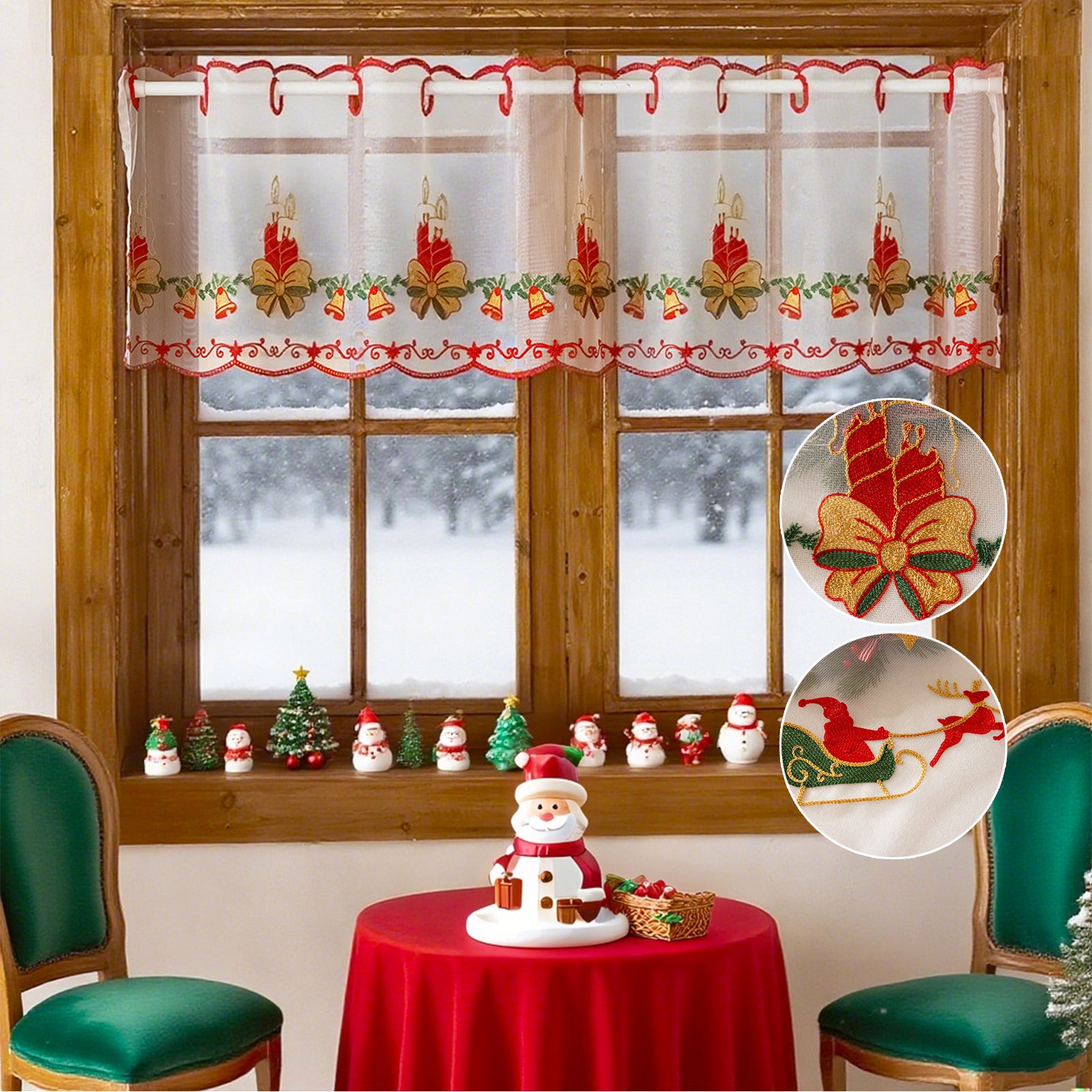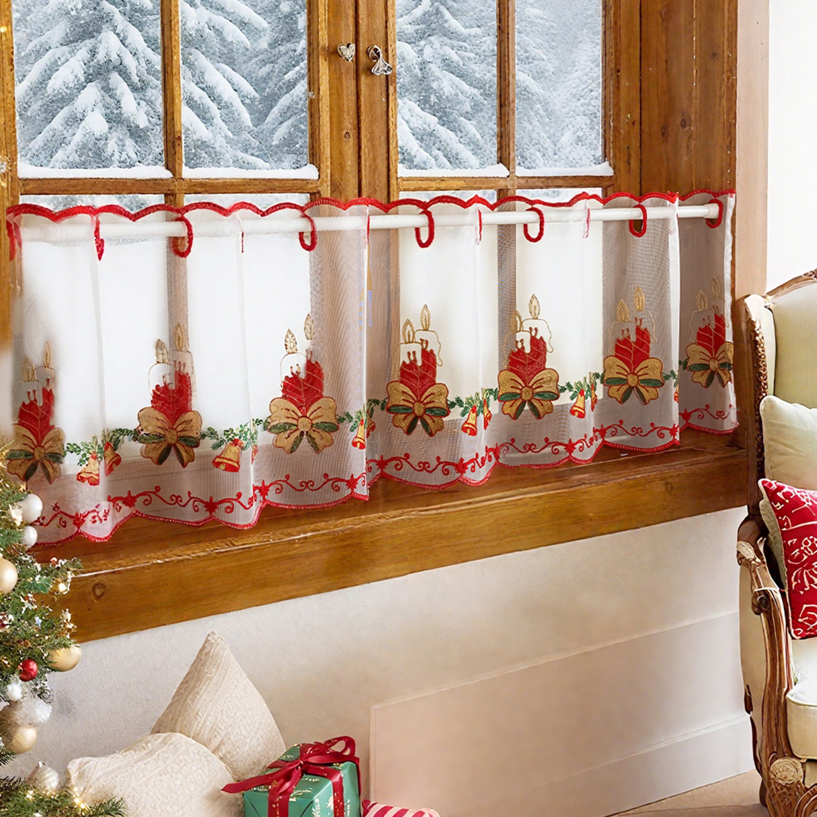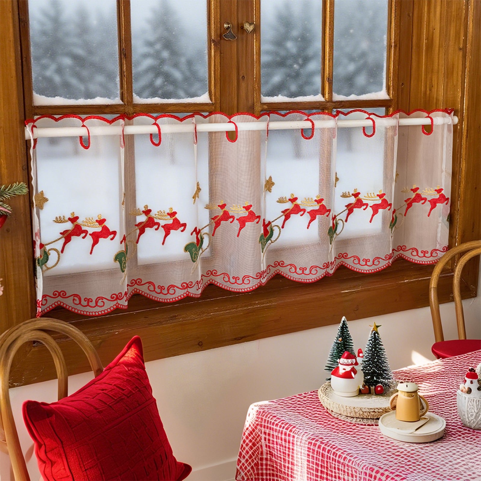 Diese weiße Kurzgardine mit roter und goldener Stickerei bringt festlichen Glanz in Ihr Zuhause. Das zarte, transparente Gewebe filtert das Licht sanft und verleiht jedem Raum eine warme, weihnachtliche Stimmung. Ideal für Küchen, Wohnzimmer oder Kinderzimmer – perfekt abgestimmt auf Ihre Weihnachtsdekoration mit Schneemann oder Tannenbaum.