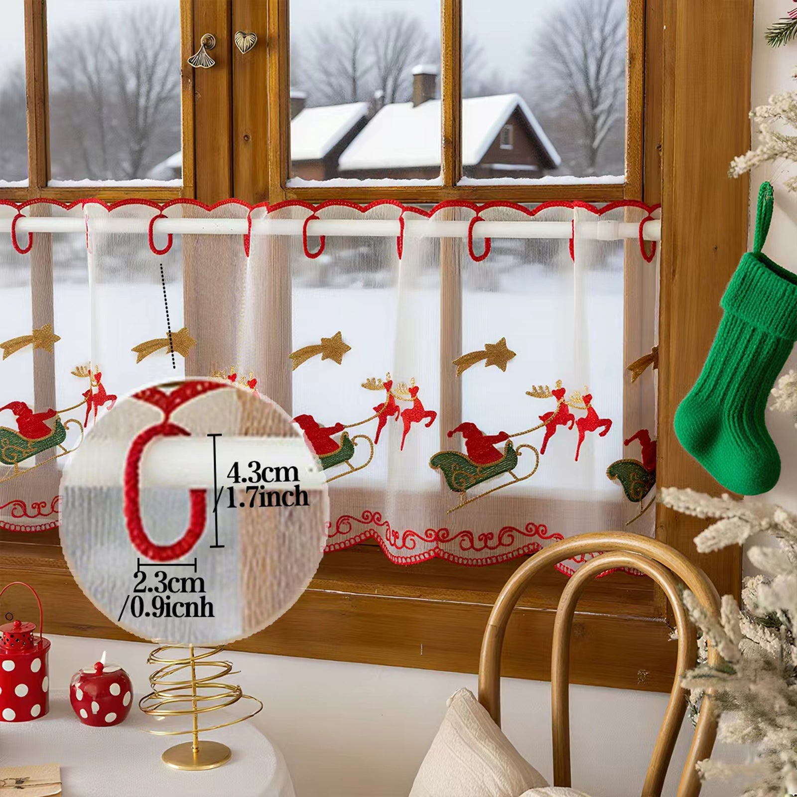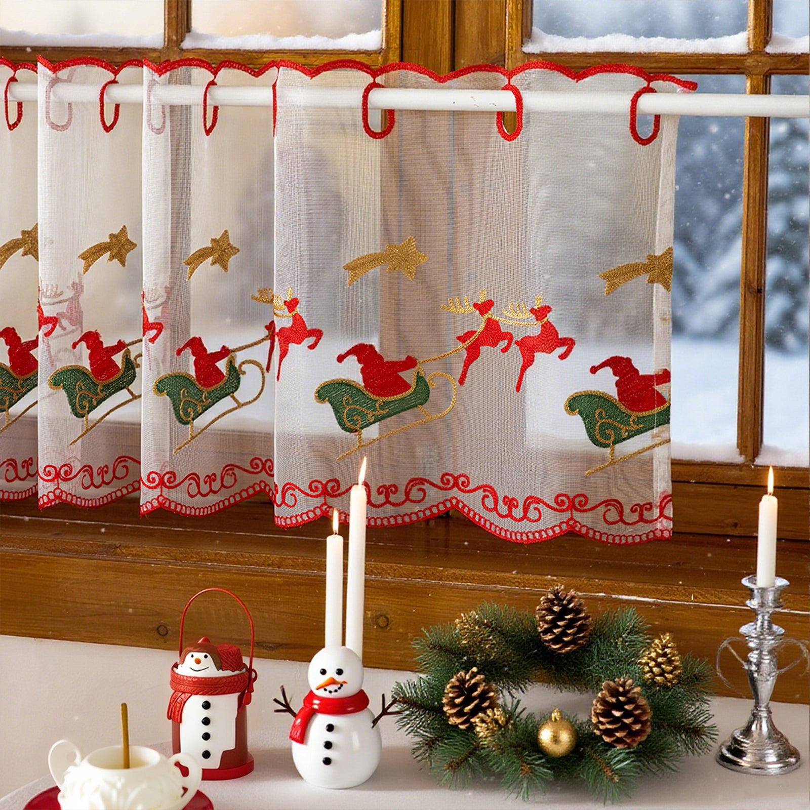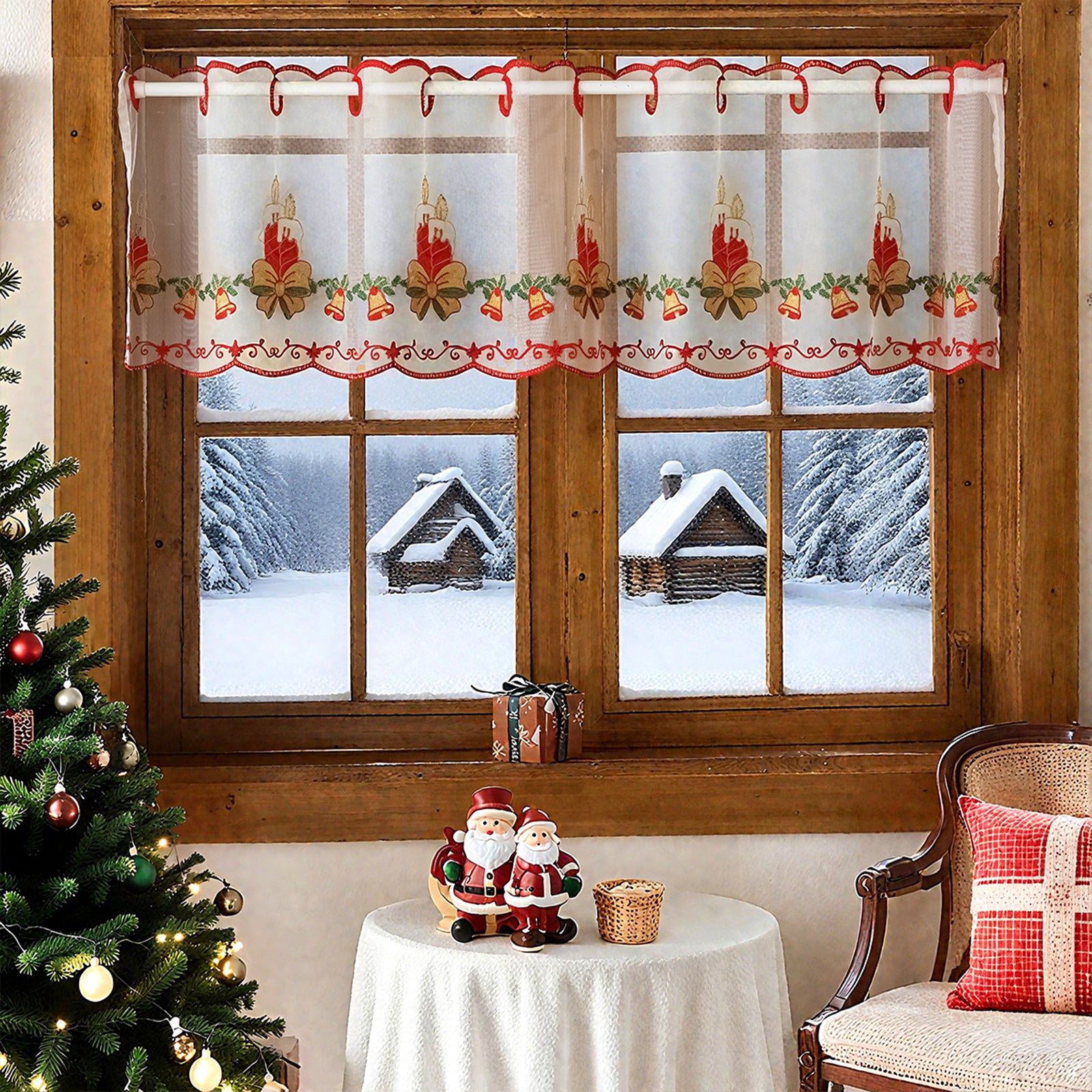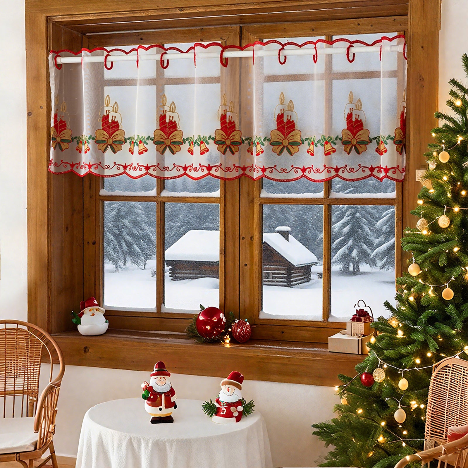 Diese weiße Kurzgardine mit roter und goldener Stickerei bringt festlichen Glanz in Ihr Zuhause. Das zarte, transparente Gewebe filtert das Licht sanft und verleiht jedem Raum eine warme, weihnachtliche Stimmung. Ideal für Küchen, Wohnzimmer oder Kinderzimmer – perfekt abgestimmt auf Ihre Weihnachtsdekoration mit Schneemann oder Tannenbaum.