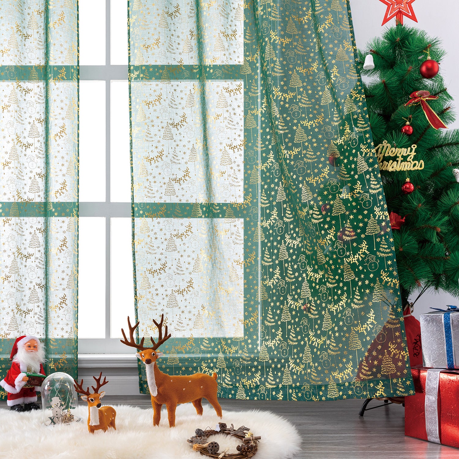 • 2-teiliges Kurzgardinen-Set mit goldenen Schneeflocken-, Baum- und Weihnachtsmotiven
