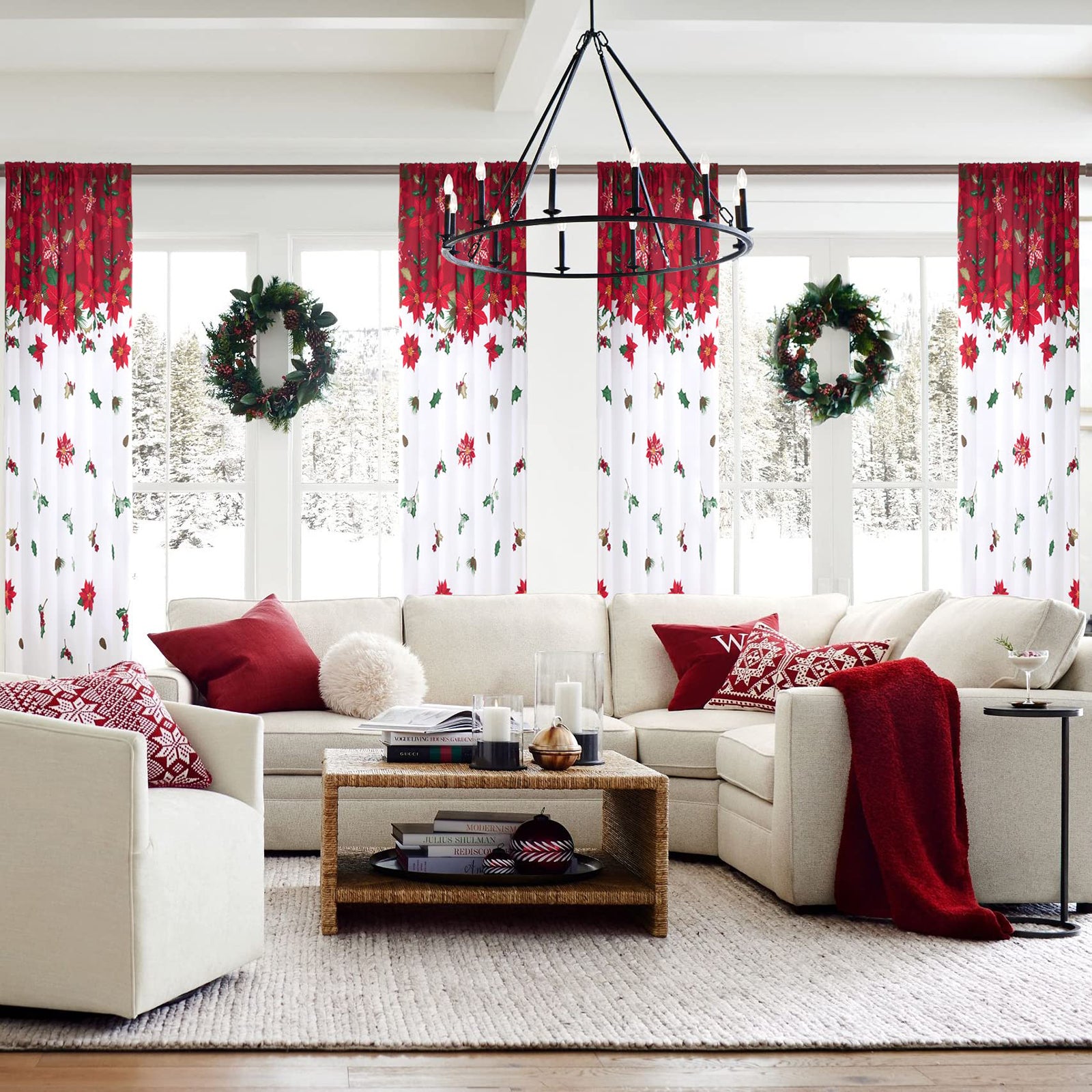 Diese festlichen Vorhänge bringen Weihnachtsstimmung direkt in Ihr Zuhause. Das weiße Grundgewebe ist mit leuchtend roten Weihnachtssternen, Stechpalmen und Kiefernzapfen bedruckt – perfekt abgestimmt auf Ihren Adventskranz oder Weihnachtsbaum. Ein zarter Farbverlauf am Saum verleiht den Vorhängen zusätzliche Tiefe und Eleganz.