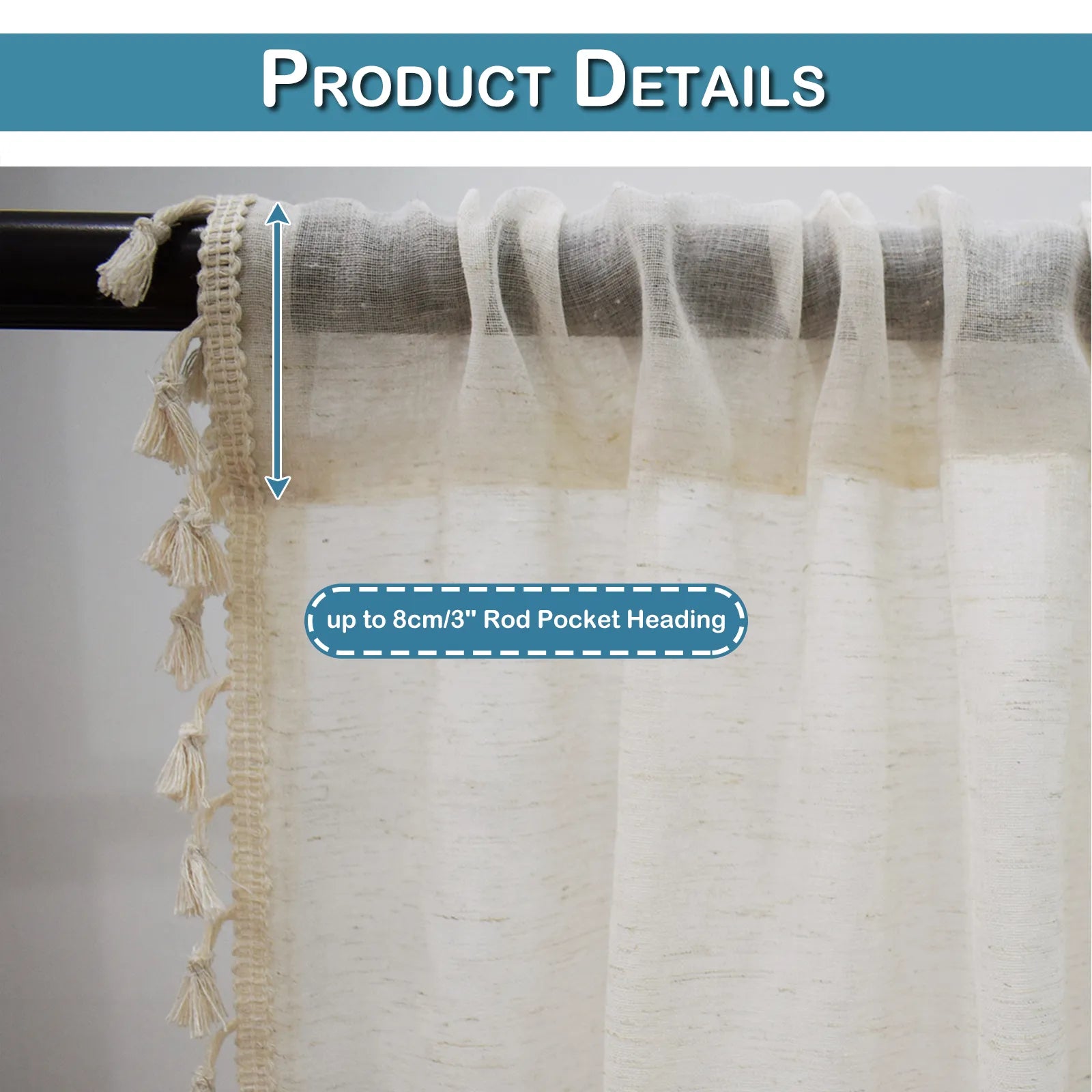 Die transparente Gardine mit dekorativen Quasten bringt romantischen Vintage-Charme in Ihr Zuhause. Das leichte Voile-Gewebe lässt Tageslicht sanft einfallen, sorgt für eine helle und freundliche Atmosphäre und bietet zugleich ein angenehmes Maß an Privatsphäre.