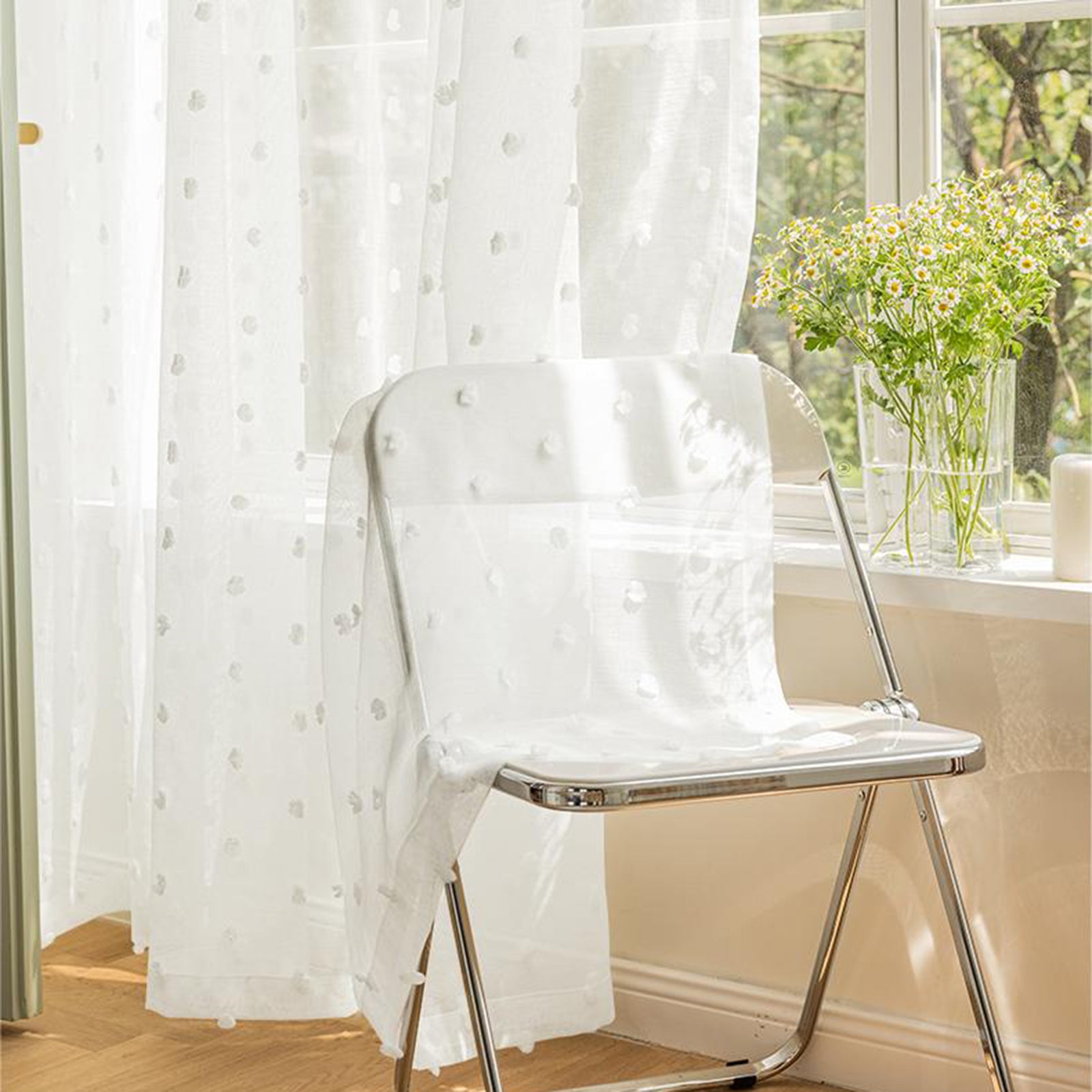 • Elegante weiße Gardine mit verspielten Pompoms