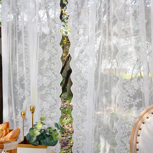 Two-piece transparent lace curtain with floral pattern and rod pocket in white