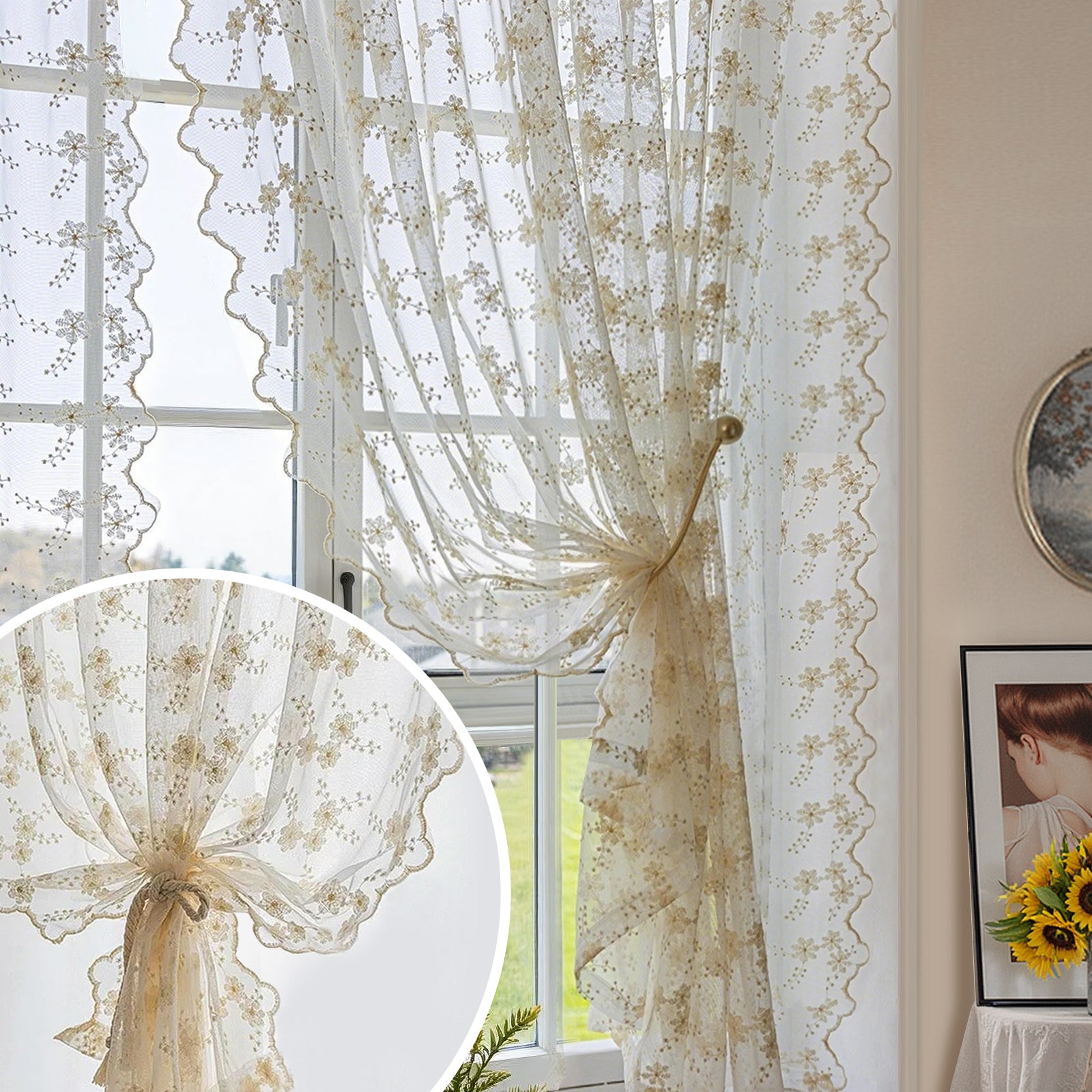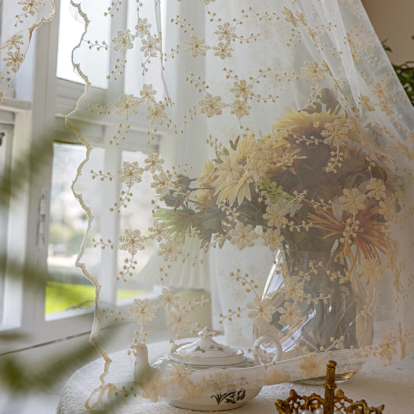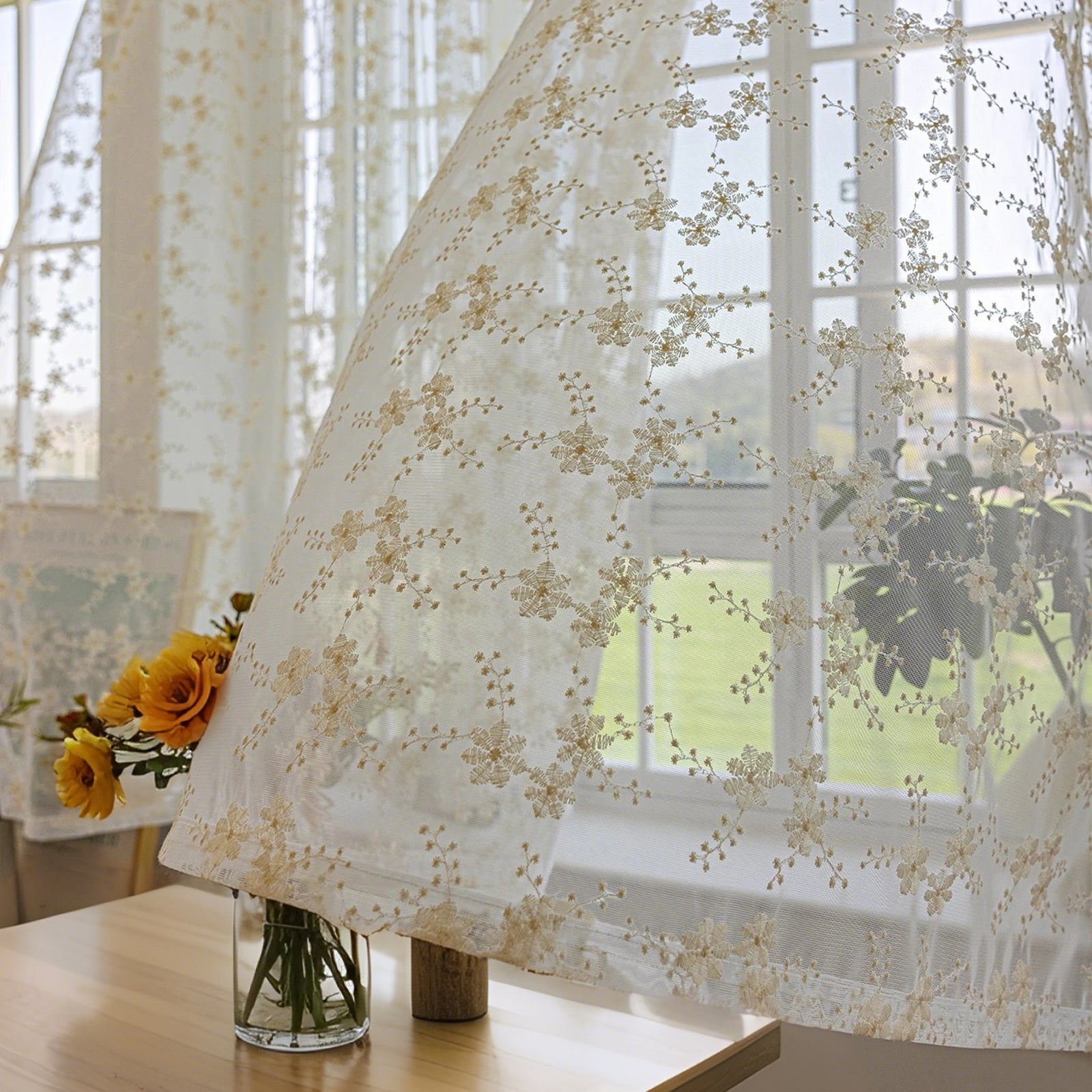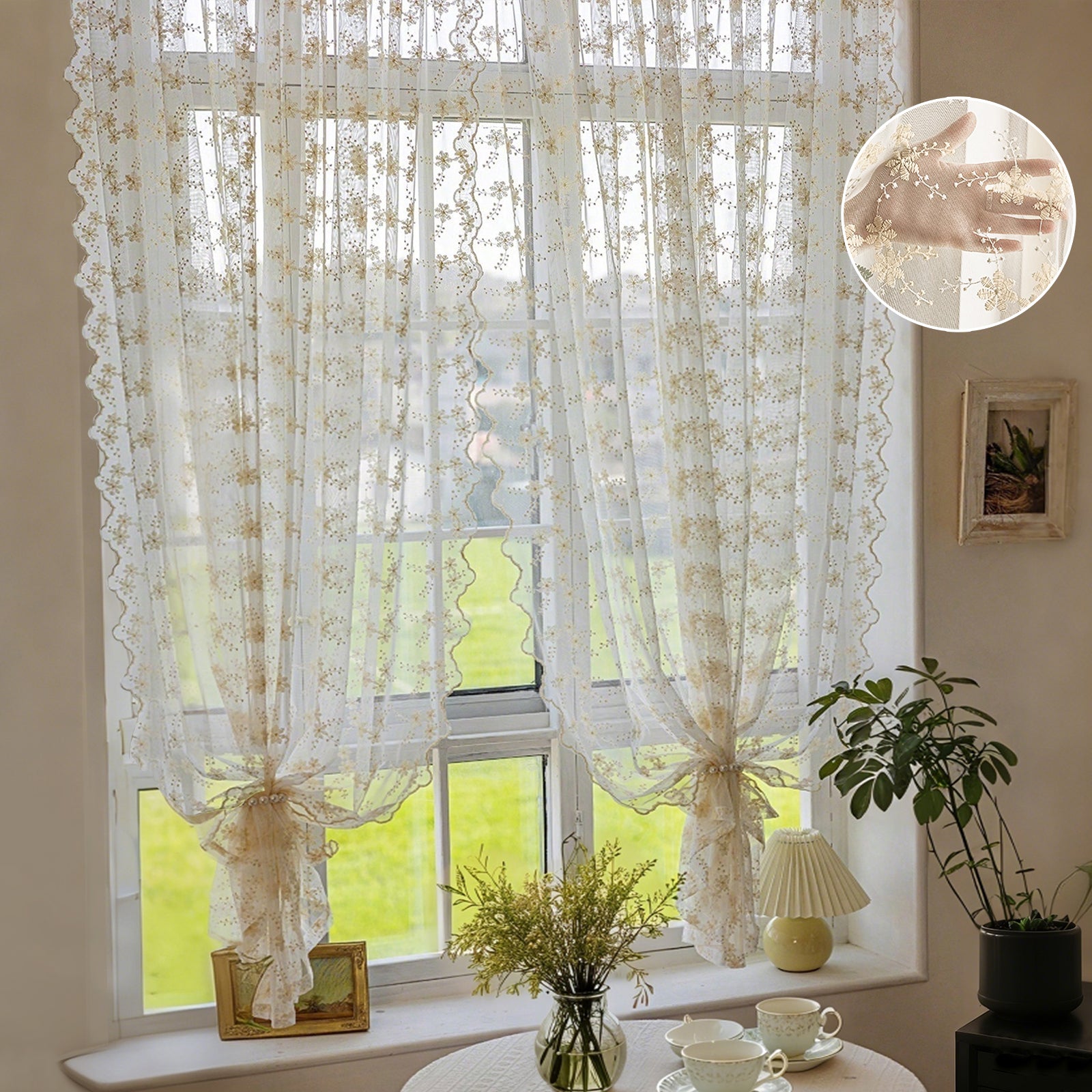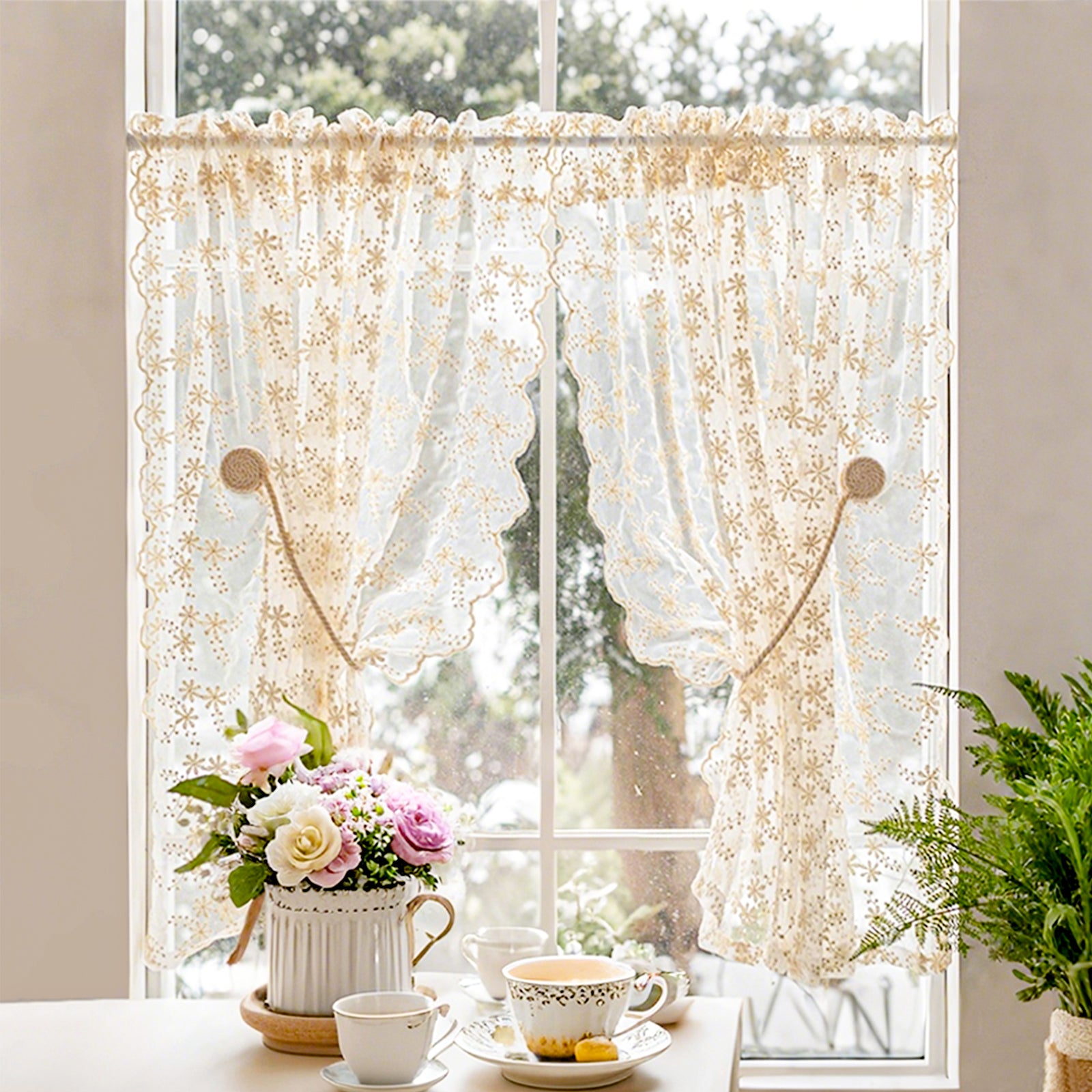 This two-piece set of white, embroidered curtains brings a delicate, romantic atmosphere to your home. The semi-transparent fabric panels gently let in light, creating a cozy atmosphere, and are ideal for living rooms, bedrooms, children's rooms, or festive occasions such as weddings and parties.