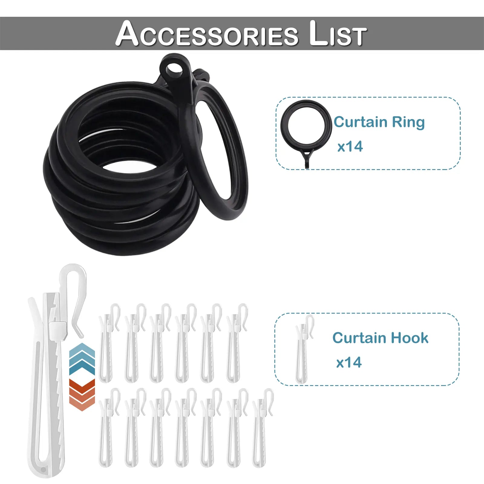 • Includes 14 hooks and 14 rings for flexible mounting on rod or rail