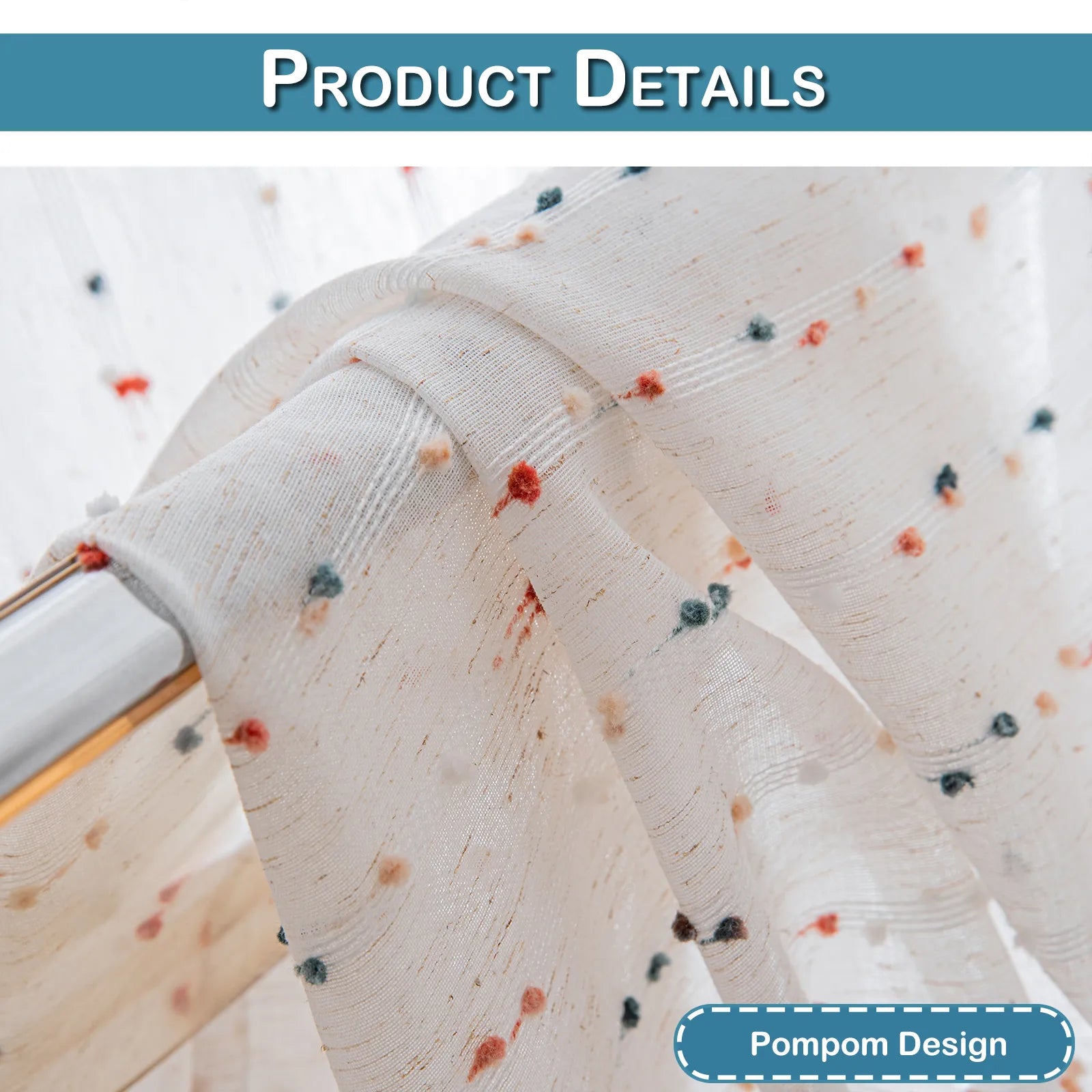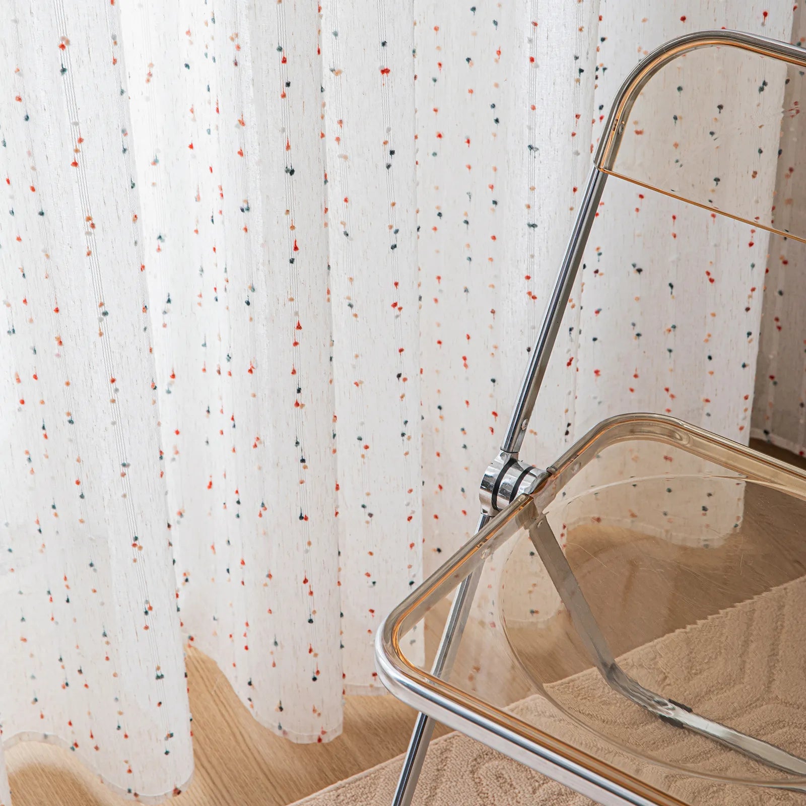 • White transparent curtain with decorative pompoms
