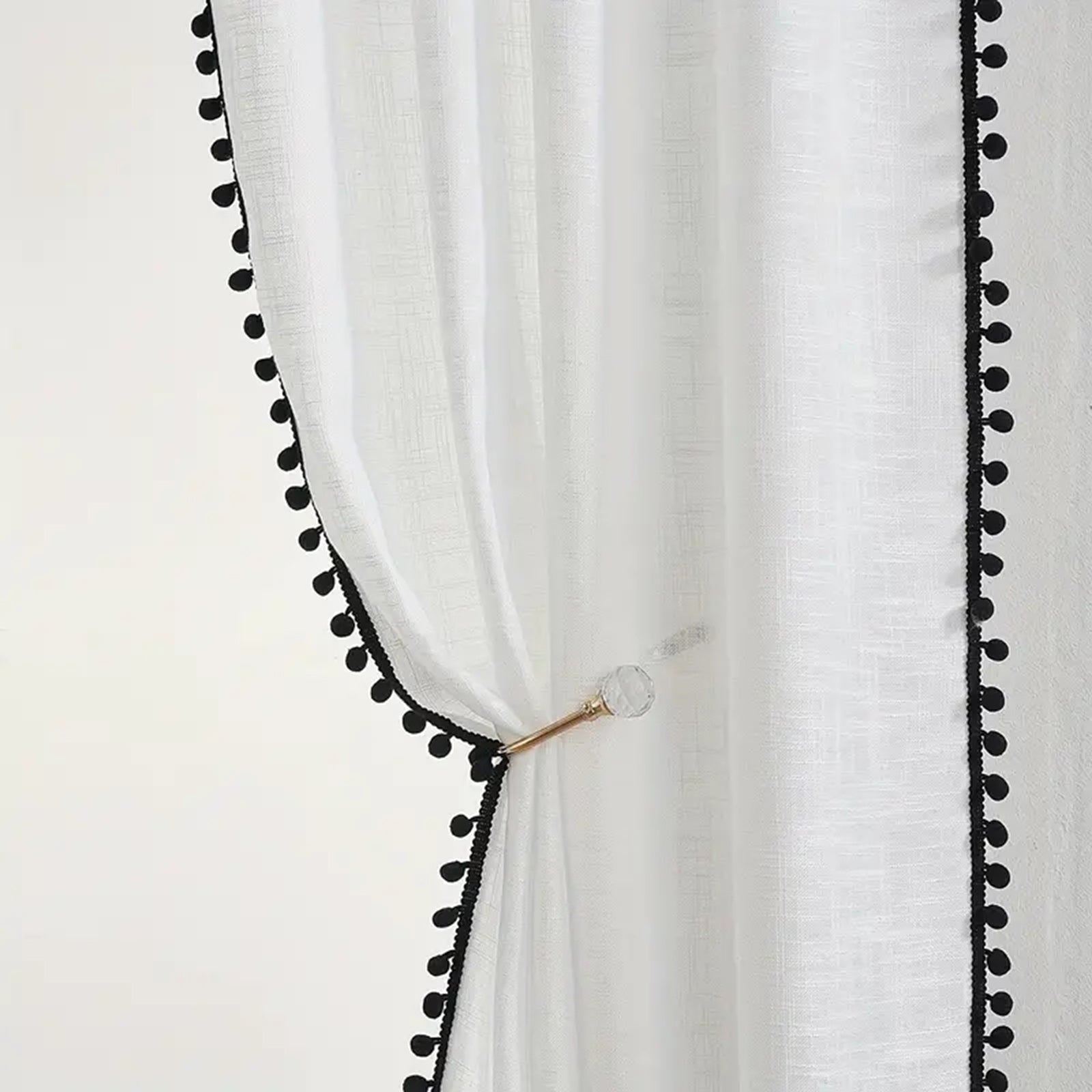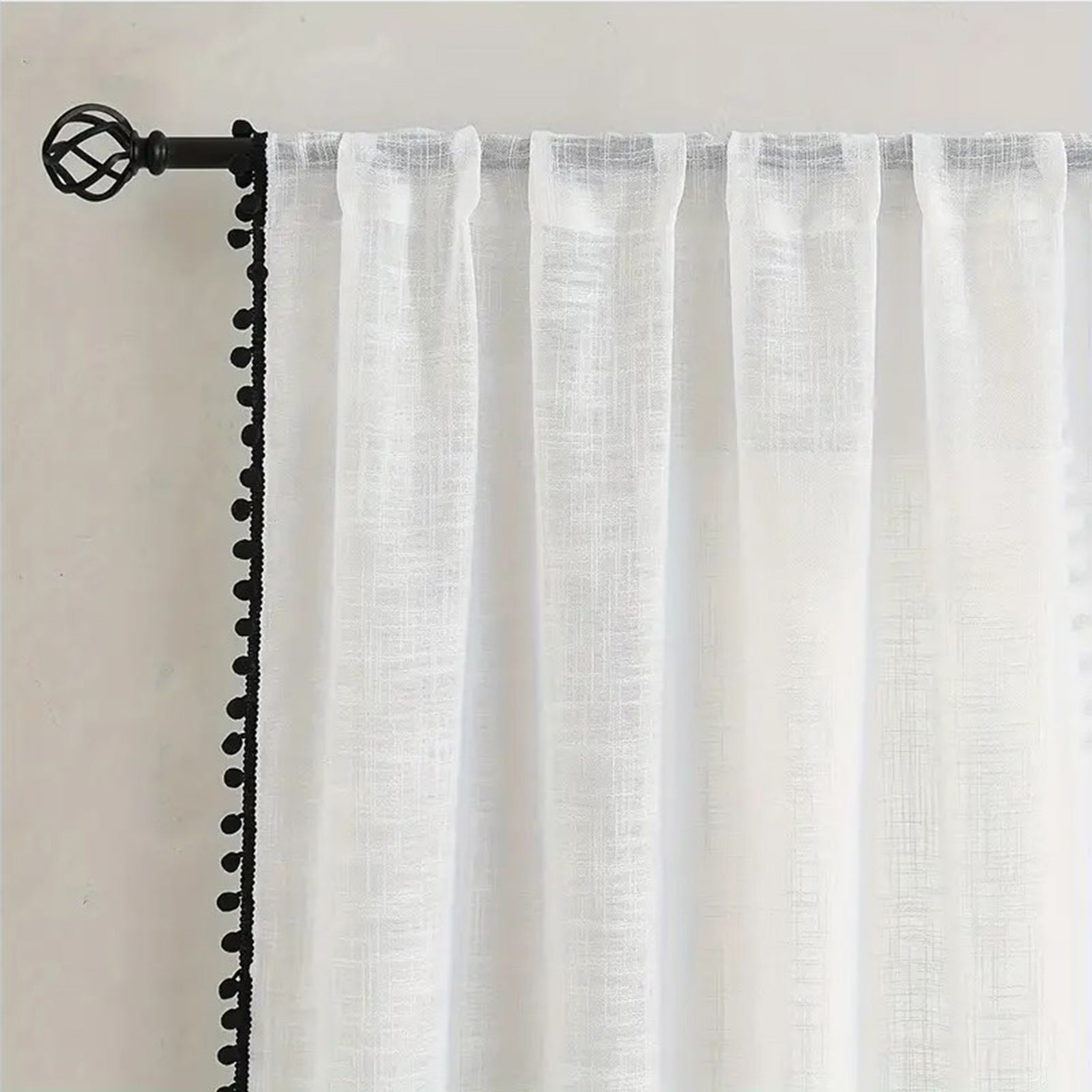 Sheer curtain with pompoms – boho style, white with black, rod pocket