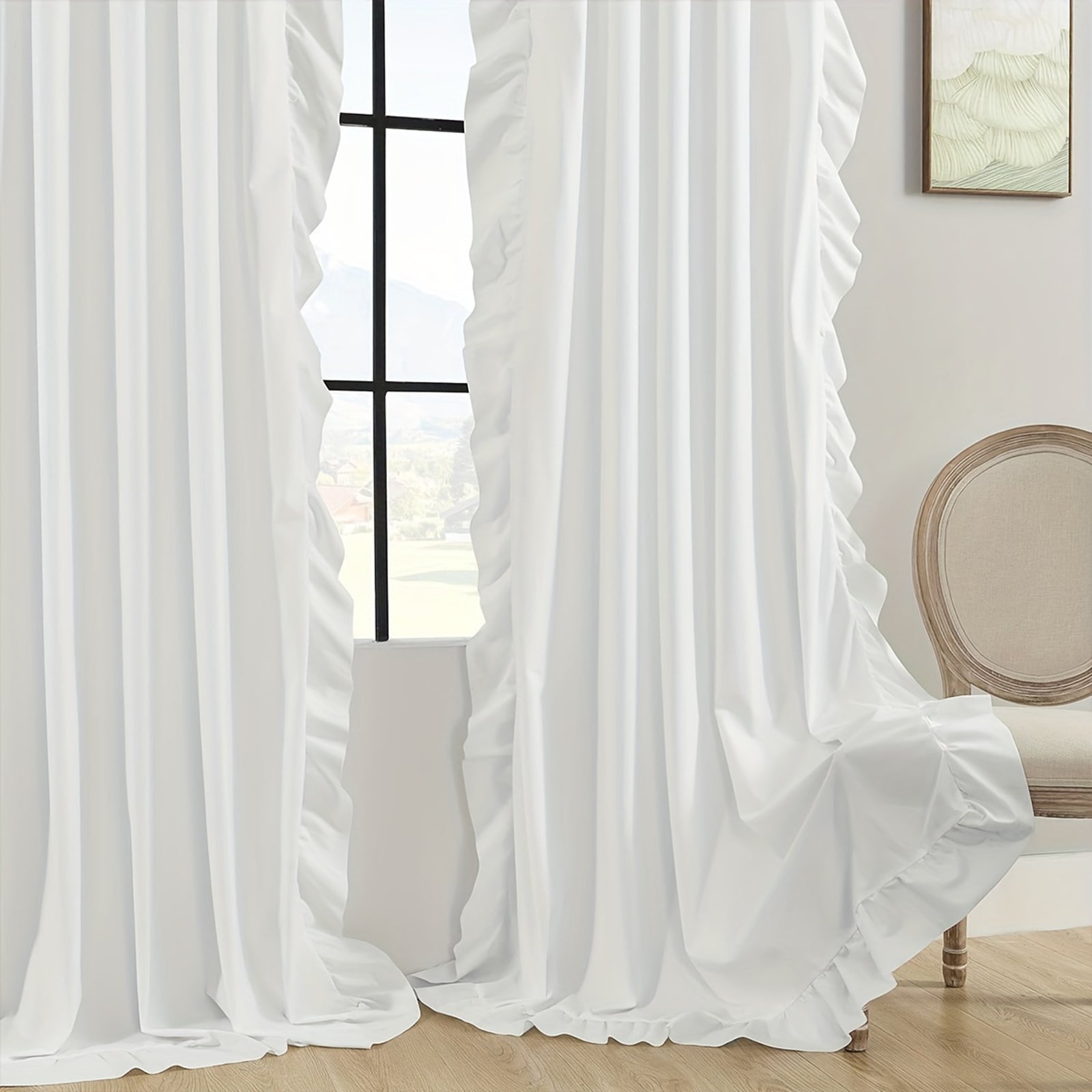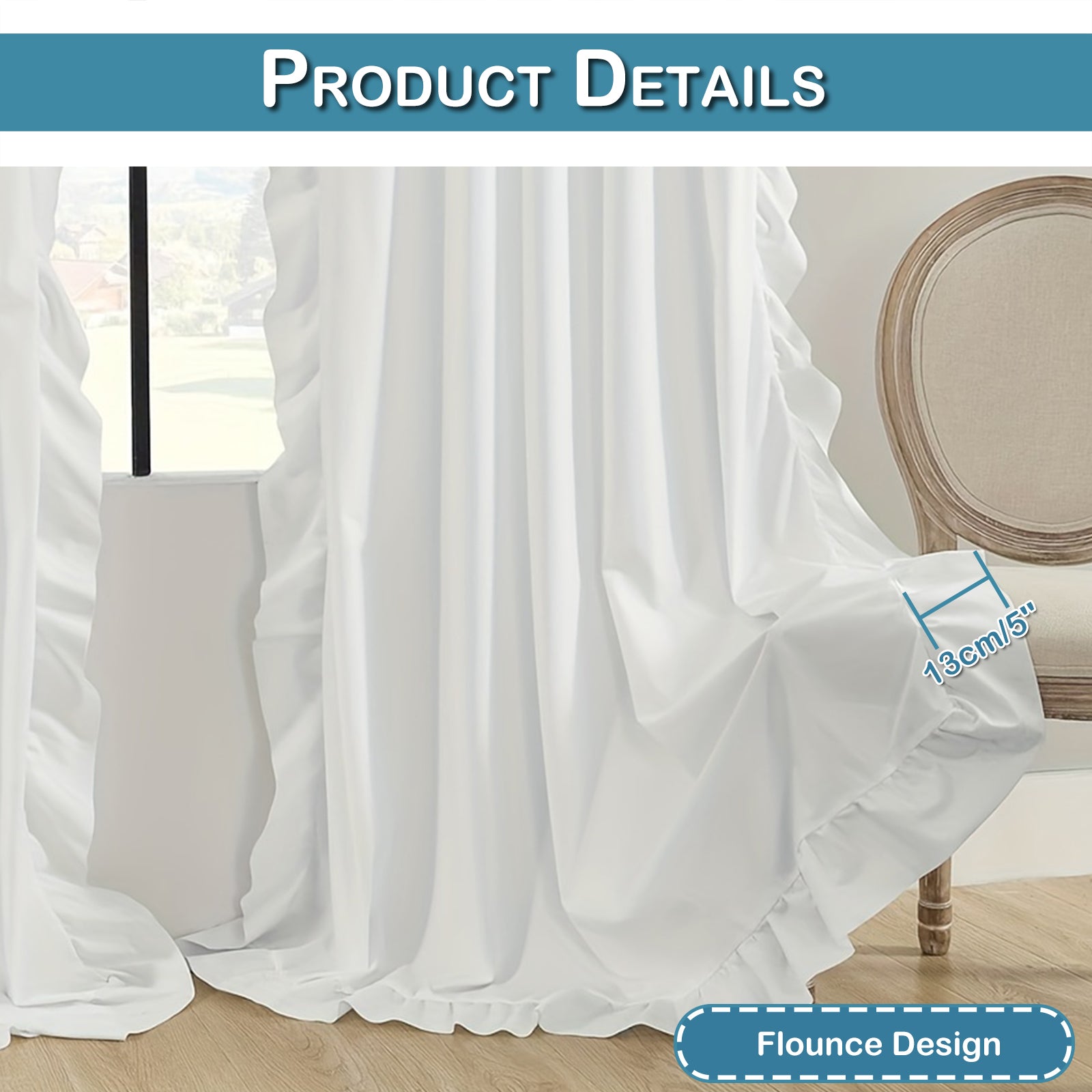 The elegant ruffle design on three sides makes the curtain a real eye-catcher—ideal for living rooms, bedrooms, children's rooms, or as stylish decorations for weddings and parties. Thanks to the rod pocket design, installation is quick and easy. Each curtain comes with a matching tieback (random color).