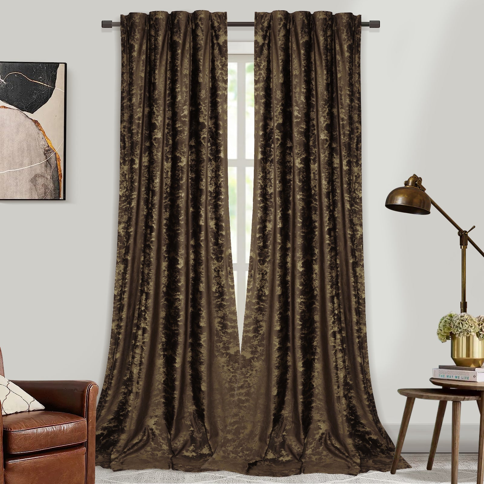 These luxurious velvet curtains with a sophisticated gold print combine functionality with stylish elegance. The heavy, tightly woven velvet fabric provides reliable blackout, reduces noise, and contributes to a peaceful, cozy atmosphere. Ideal for bedrooms, living rooms, or home theaters.