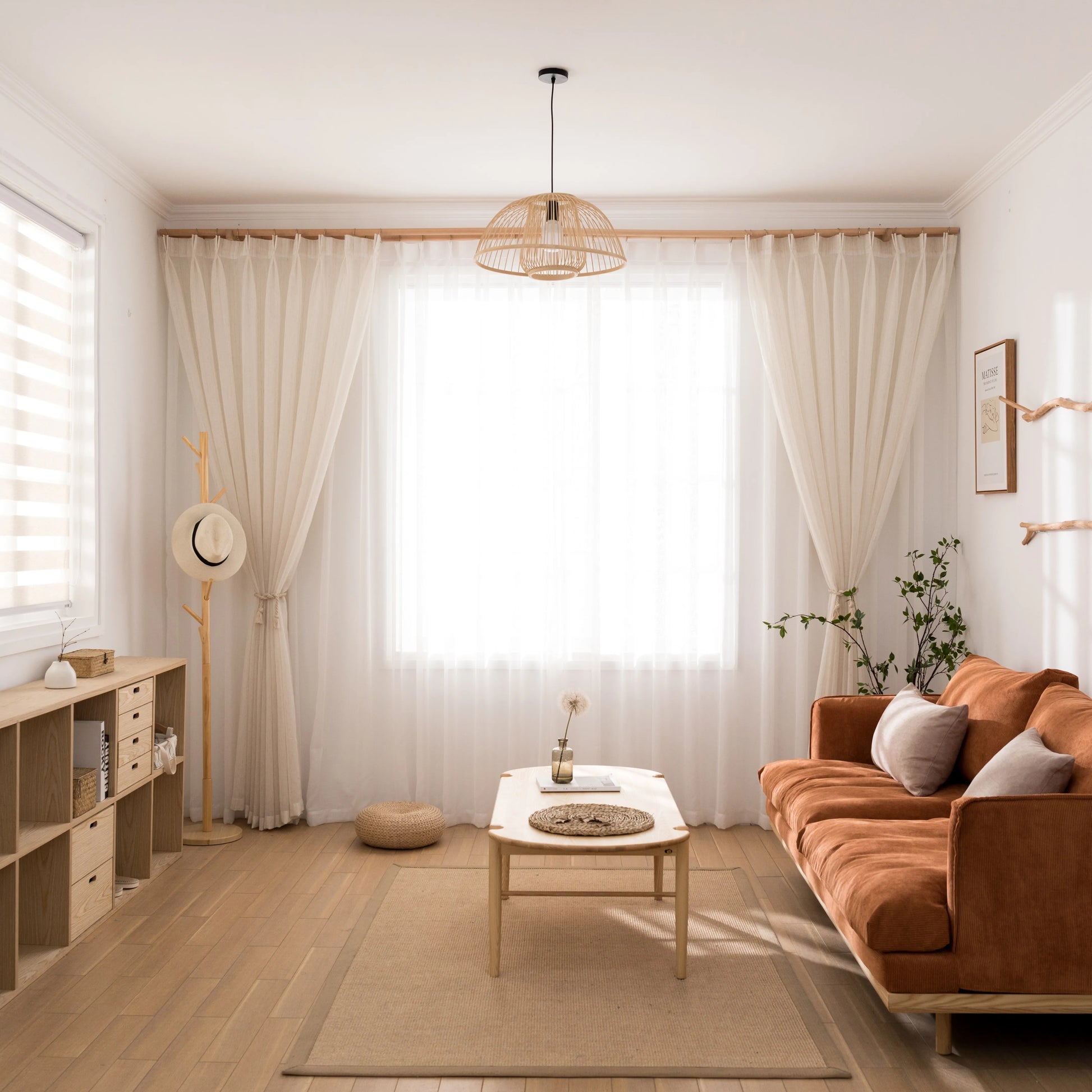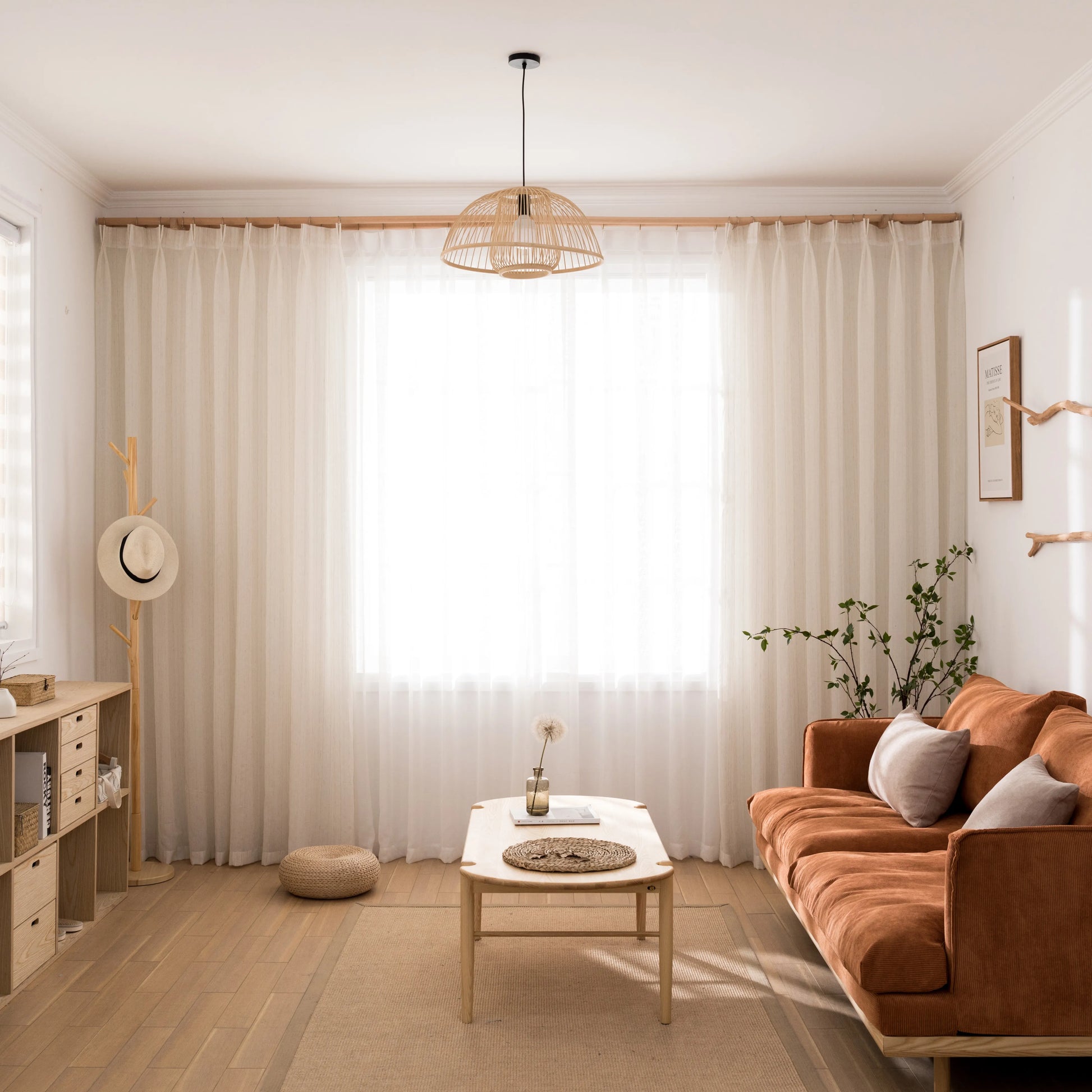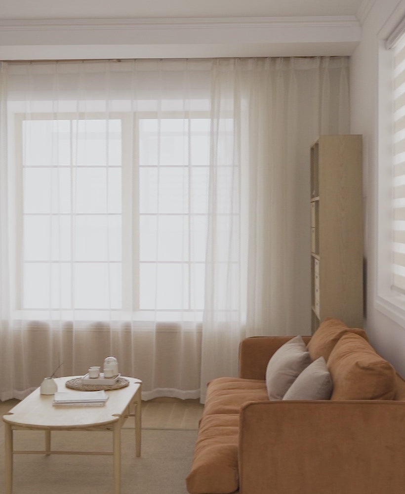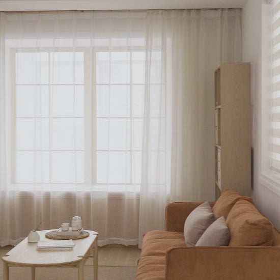 Ce rideau léger est idéal pour les salons, les chambres, les salles à manger ou les espaces de travail lumineux. Il structure les grandes fenêtres sans alourdir visuellement la pièce et souligne un design intérieur intemporel et raffiné.