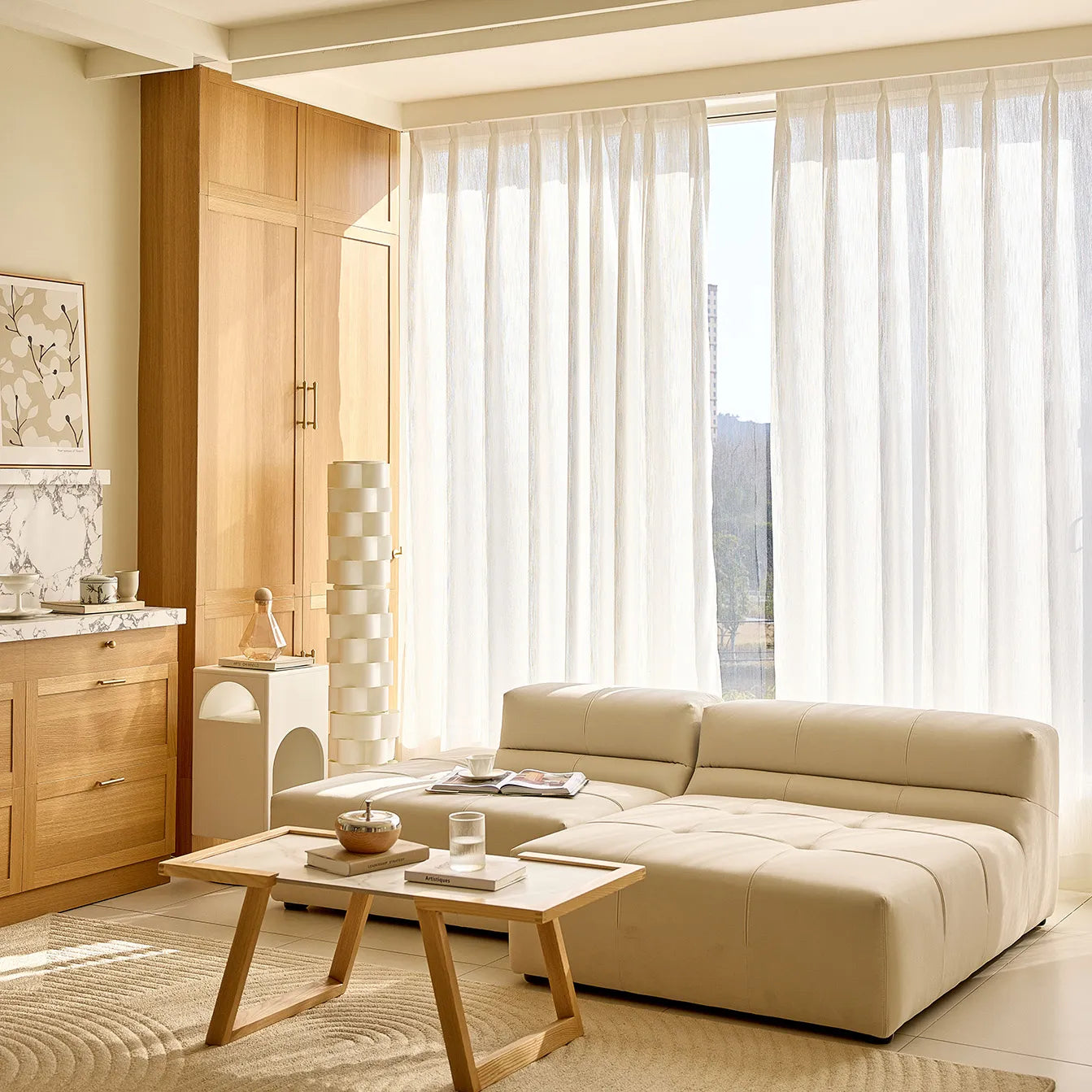 Son tissage subtil évoque les fibres naturelles et s'intègre harmonieusement aux styles de décoration intérieure modernes, scandinaves et intemporels. Idéal pour les salons et les chambres où la légèreté et la sérénité sont essentielles.