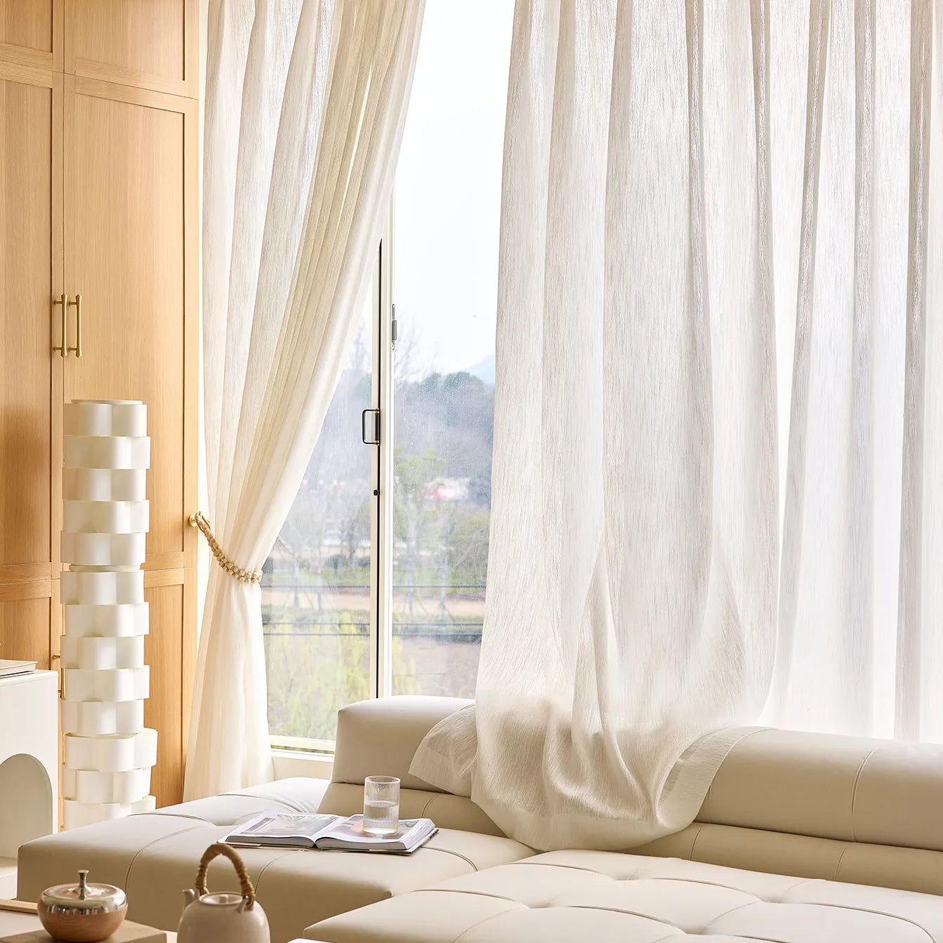 Ce voile léger, confectionné sur mesure, laisse filtrer délicatement la lumière du jour dans la pièce, créant une atmosphère lumineuse et apaisante. Son tissage fin et texturé confère au tissu profondeur et un aspect naturel.
