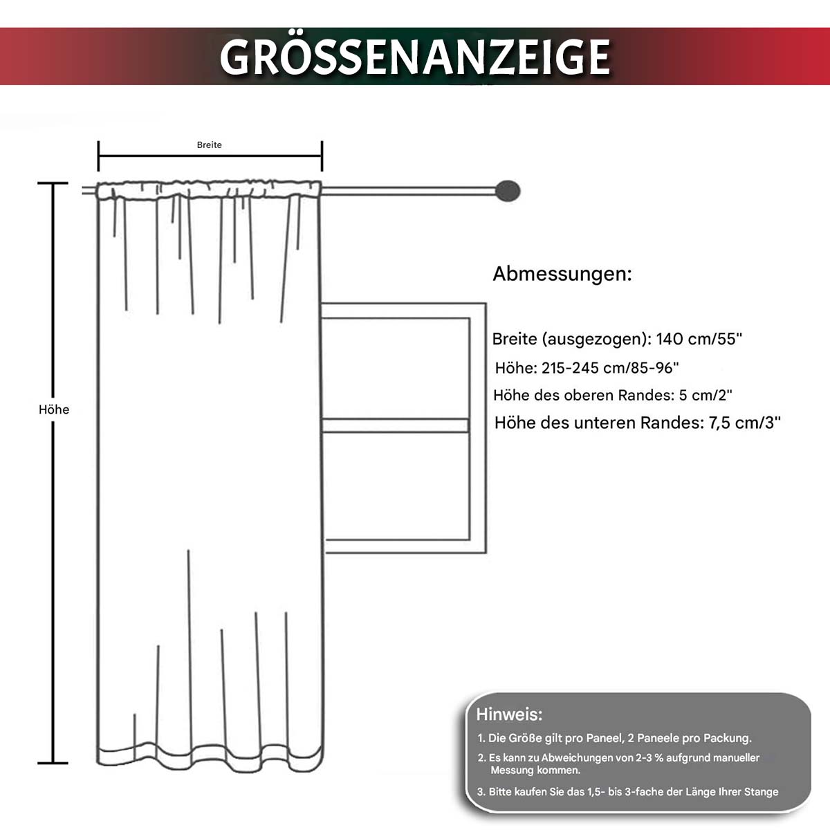 Fabriqués en polyester 240 g/m², ces rideaux bloquent 40 à 50 % de la lumière, réduisent l'éblouissement et diffusent une douce lumière tamisée. Ils créent une ambiance chaleureuse et festive dans le salon ou la chambre.