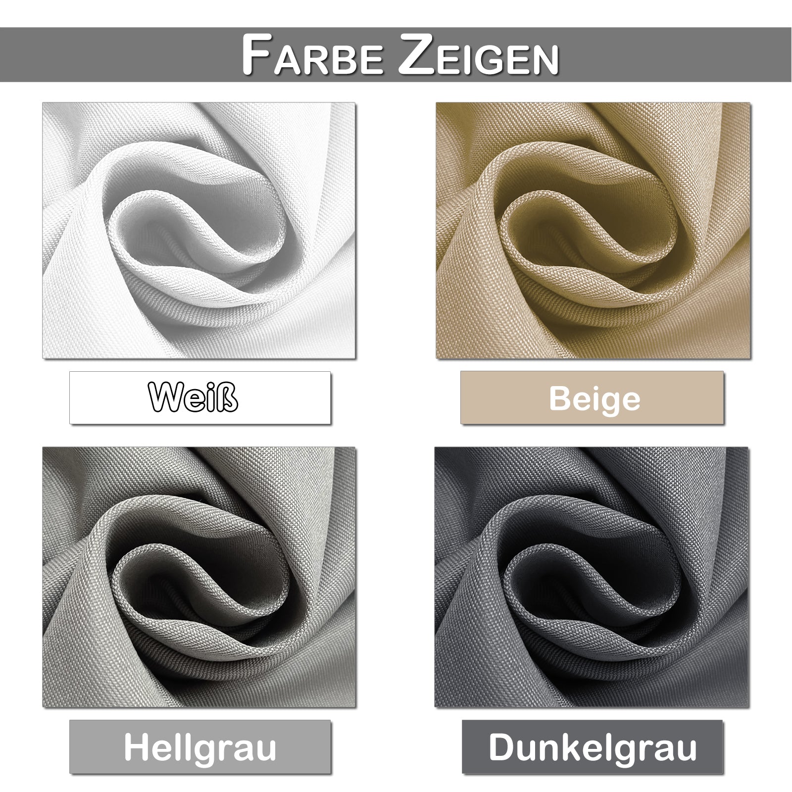 Dunkle Farben koennen bei intensiver Sonneneinstrahlung langsam ausbleichen. Fuer langfristige Farbstabilitaet empfehlen wir helle Naturtoene. Die Breite sollte etwa das 1,5 bis 3 fache der Fensterbreite betragen.